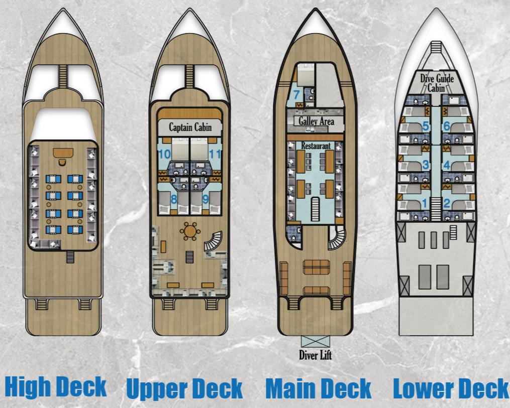 Designed to accommodate divers of all levels, our boat boasts spacious cabins, modern amenities, and a dedicated diving deck. Each detail of the vessel reflects our commitment to providing a superior diving experience. From the advanced filling stations for technical diving to the comfortable relaxation areas, every aspect of the boat is tailored to meet the needs of our guests.